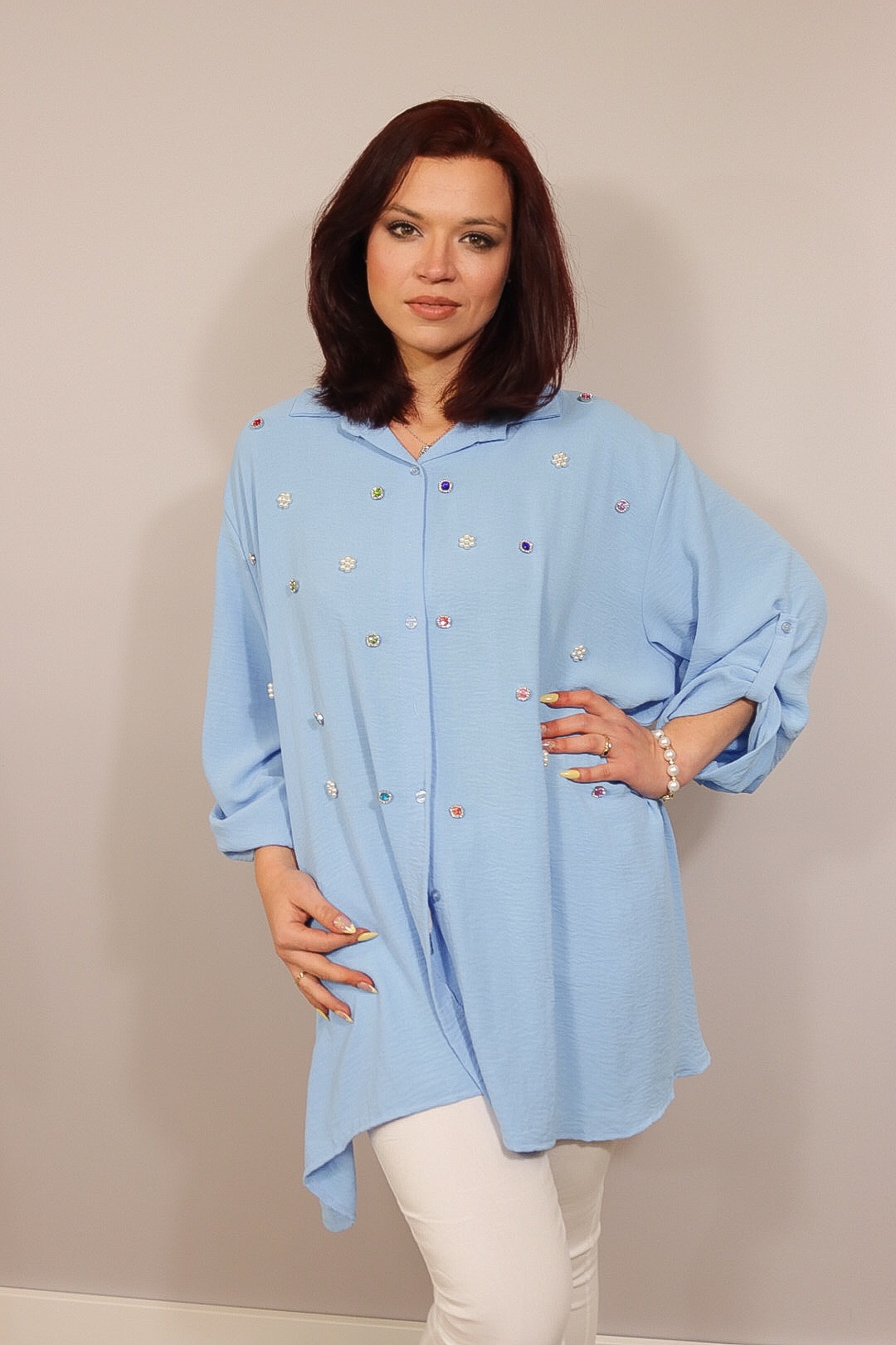 Een lange blouse met een elegante en speelse uitstraling. De blouse heeft een klassieke kraag, knoopsluiting en subtiele sierdetails op de voorkant die zorgen voor een luxe look. De mouwen kunnen opgestroopt en vastgezet worden met een knoopje. De luchtige stof valt soepel en draagt comfortabel. Draagbaar t/m maat 46/48.