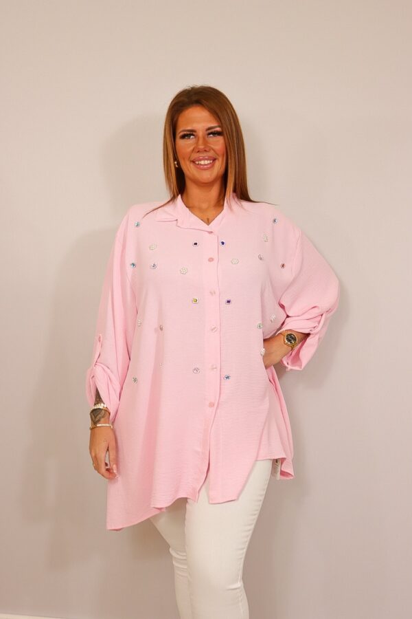 Een lange blouse met een elegante en speelse uitstraling. De blouse heeft een klassieke kraag, knoopsluiting en subtiele sierdetails op de voorkant die zorgen voor een luxe look. De mouwen kunnen opgestroopt en vastgezet worden met een knoopje. De luchtige stof valt soepel en draagt comfortabel. Draagbaar t/m maat 46/48.
