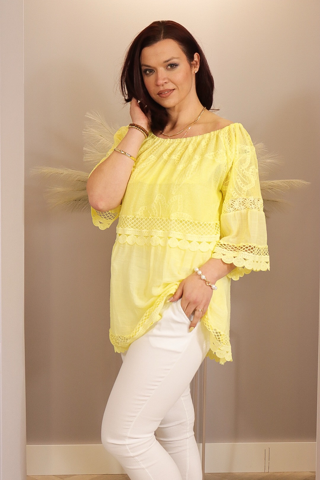 Luchtige off-shoulder blouse met een speelse lace structuur en een losvallende fit. Perfect voor een zomerse, vrouwelijke look en heerlijk comfortabel te dragen.