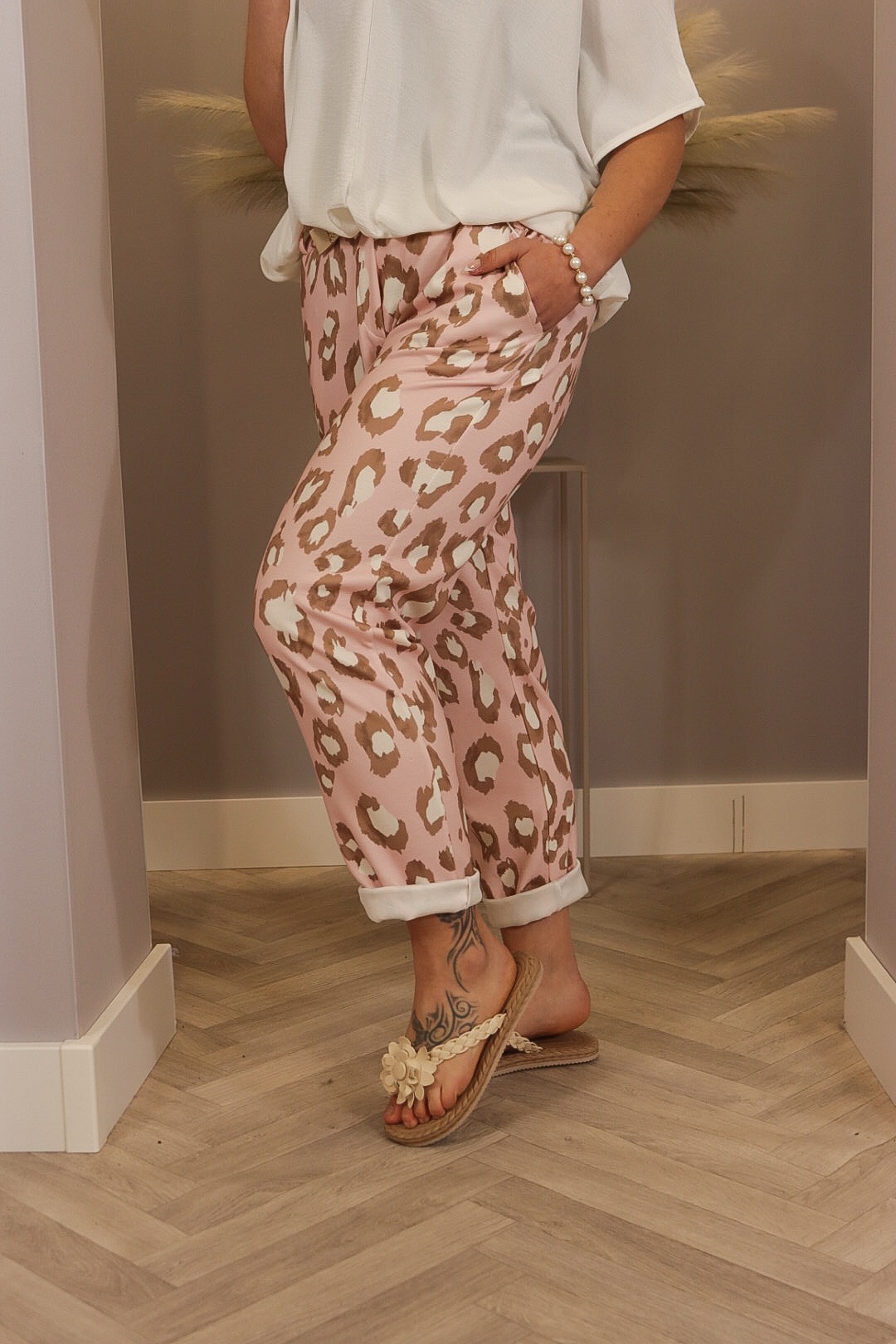Deze comfy broek met leopard print is echt zo’n item dat je meteen wilt dragen. De stof is lekker zacht en soepel met fijne stretch, waardoor hij super comfortabel zit. Dankzij de riem kun je ‘m mooi tailleren en de fit naar wens aanpassen. Verkrijgbaar in roze, geel, mint en blauw en draagbaar t/m maat 46.