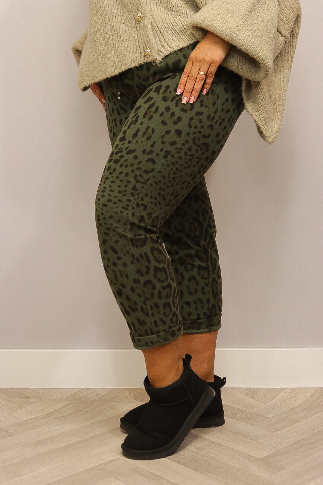 Deze broek is een echte eyecatcher. De dikkere stof en de stoere luipaardprint zorgen voor een comfortabele maar trendy look. Dankzij de elastische boord en het tunnelkoord zit hij heerlijk, en hij is draagbaar tot en met maat 46/48. Perfect om stijl en gemak te combineren.