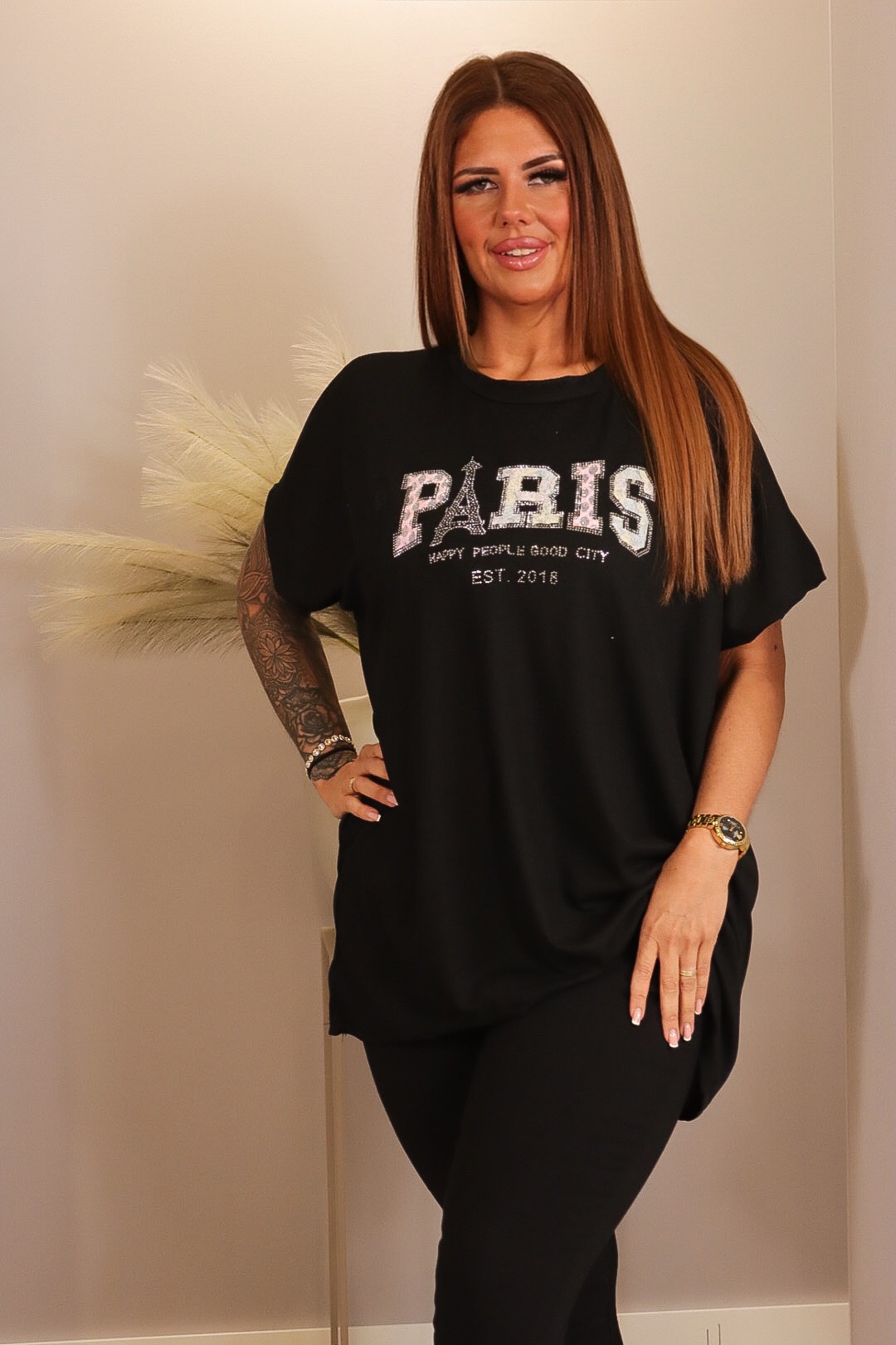 Trendy top met ribstructuur en opvallende “Paris” strass tekst. De soepele stof valt mooi en draagt heerlijk comfortabel, perfect voor een casual maar toch stijlvolle look. Leuk te combineren met een jeans of comfy broek.
