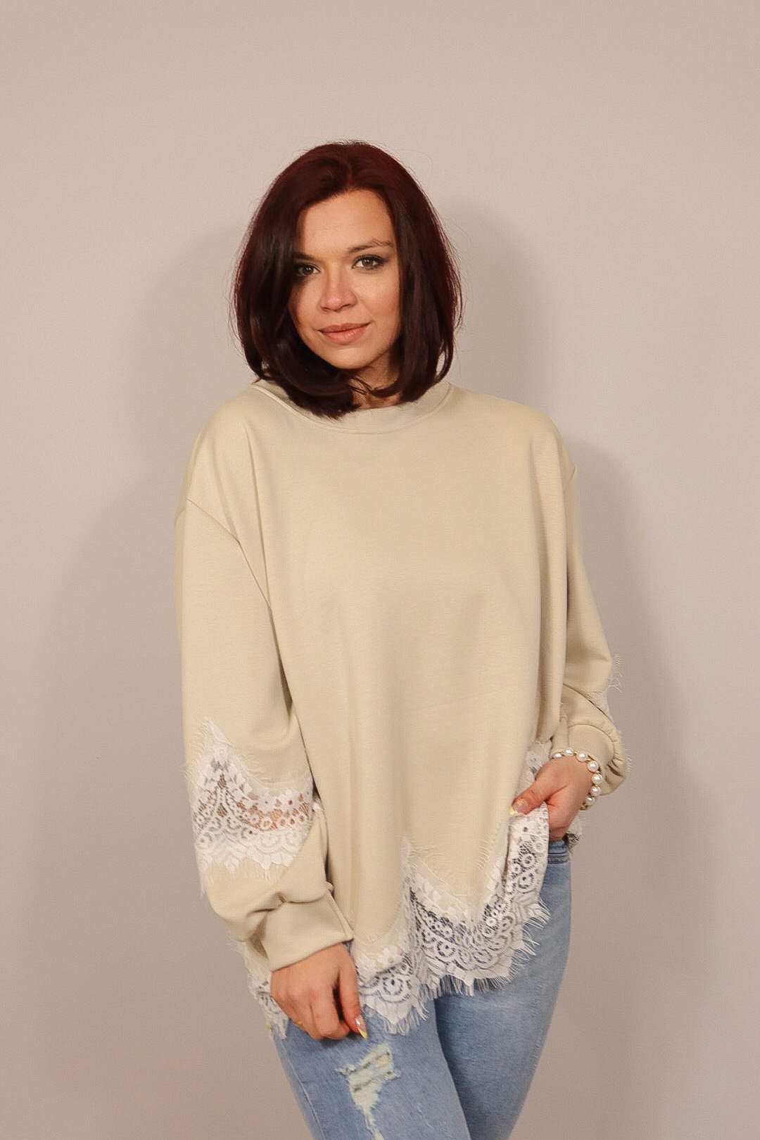 Zachte trui met een vrouwelijke lace afwerking aan de onderkant voor een speels en elegant effect. Zit heerlijk comfy en is perfect voor een casual maar stijlvolle look.