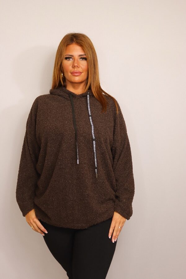 Heerlijk zachte trui/hoody Naobi van warme teddystof met capuchon. Perfect voor een cozy en trendy look op koude dagen! Verkrijgbaar in bruin, bordeaux en groen. Draagbaar t/m maat 46/48.