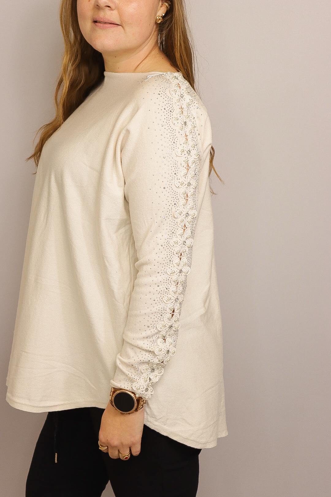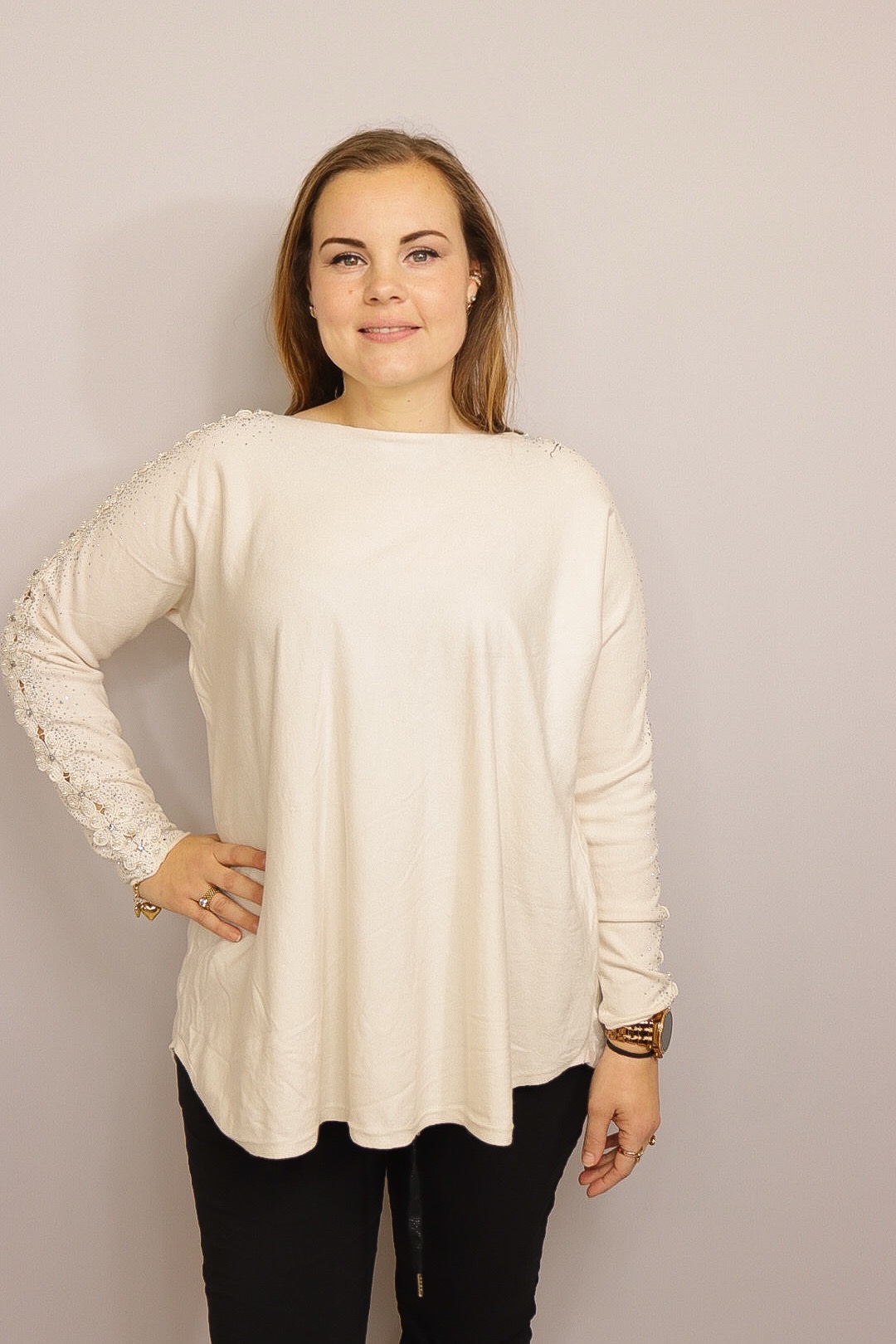 Elegante trui Party Dora met schitterende parels en strassdetails en een subtiel opengewerkte mouw voor een stijlvolle, feestelijke uitstraling. Verkrijgbaar in grijs, ecru en zwart. Draagbaar t/m maat 46/48.
