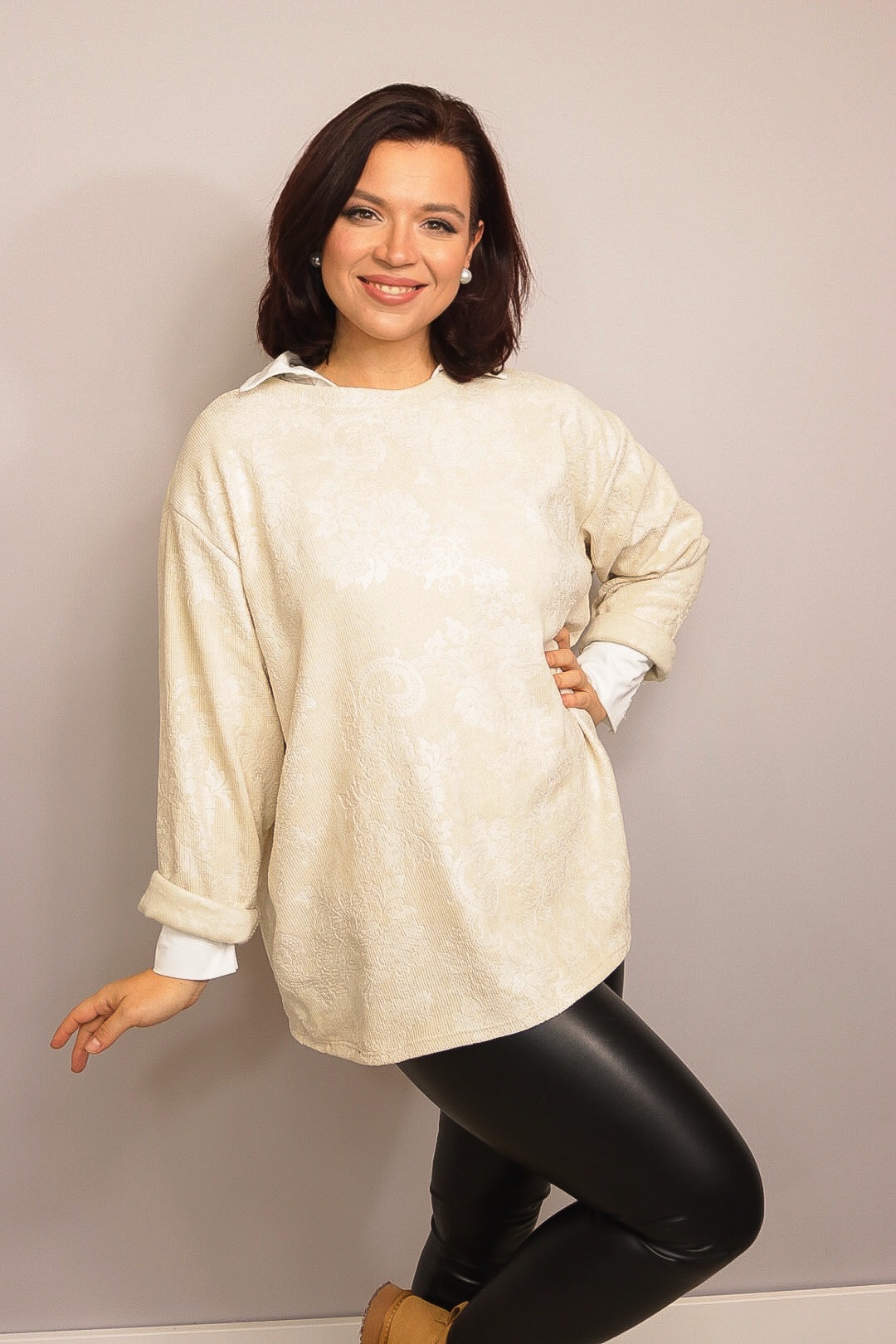 De Velvet Structura trui heeft een prachtige 3D bloemenstructuur die meteen luxe uitstraalt. Zacht, stretchy en comfortabel, en draagbaar t/m maat 48/50. Verkrijgbaar in choco, grijs en beige – perfect voor elke look.