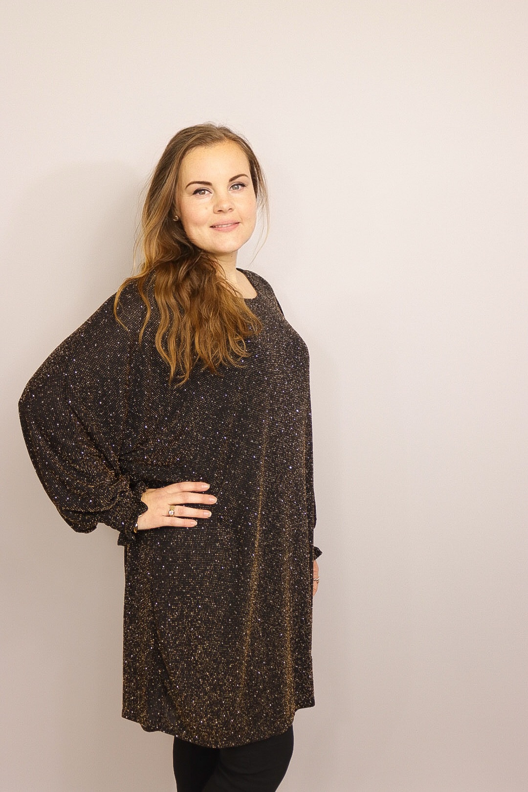 Prachtige tuniekjurk Party Glamm met elegante roezemouw en glinsterende strassdetails. De jurk straalt luxe en feestelijkheid uit voor een bijzondere gelegenheid. Verkrijgbaar in zwart/brons met strass en zwart/zilver met strass. Draagbaar t/m maat 48/50.